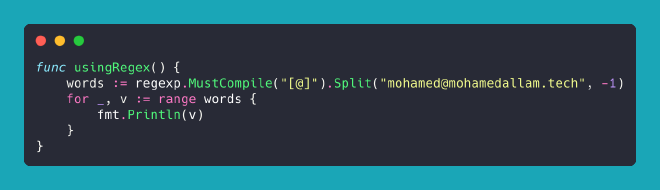 words := regexp.MustCompile("[@]").Split("mohamed@mohamedallam.tech", -1)